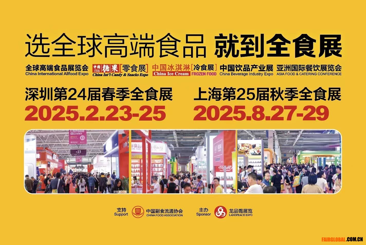 “全球高端食品展覽會”,簡稱全食展,英文簡稱為Allfood Expo。展品范圍涵蓋:進(jìn)口食品、休閑食品、乳品飲料、冰淇淋、冷鏈?zhǔn)称贰⒉惋嬍巢?、預(yù)制菜與調(diào)味品、加工與包裝等。