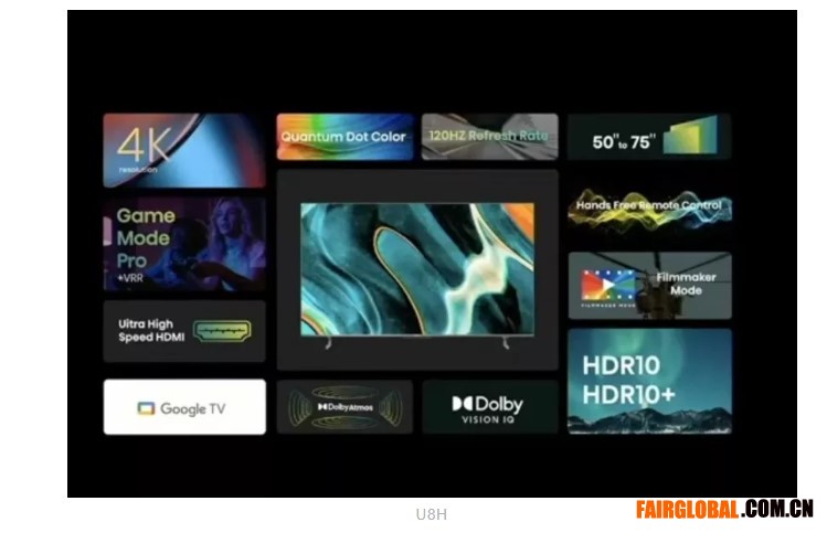 另一款Mini LED產(chǎn)品U8H,包含55/65/75英寸三個尺寸,擁有4K分辨率,120Hz刷新率,亮度可達(dá)1500nits,產(chǎn)品將在2022年第二季度中期上市,售價1099美元起。