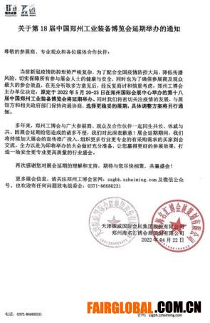 關(guān)于第18屆中國(guó)鄭州工業(yè)裝備博覽會(huì)延期舉辦的通知