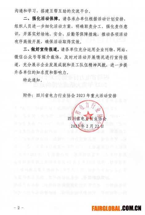 2月22日,四川省電力行業(yè)協(xié)會(簡稱“行協(xié)”)印發(fā)2023年工作計劃和重大活動安排。2023年,行協(xié)將全面貫徹落實黨的二十大報告中提出的調(diào)整能源結(jié)構(gòu)、加快規(guī)劃建設(shè)新能源體系,確保能源安全等要求,全面發(fā)揮好協(xié)會平臺、橋梁、紐帶、主體等功能,著力開展10項以上重要活動。其中,為貫徹落實黨的二十大精神,展示能源電力行